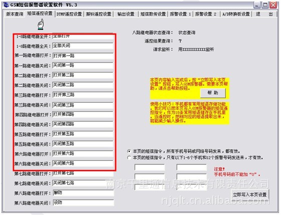短信遥控:被授权手机向本设备发送短信指令“打开**路”或“关闭**路”(出厂默认设置**可以打开**路继电器或关闭**路继电器。用户可以根据自己的需要通过电脑修改遥控指令。