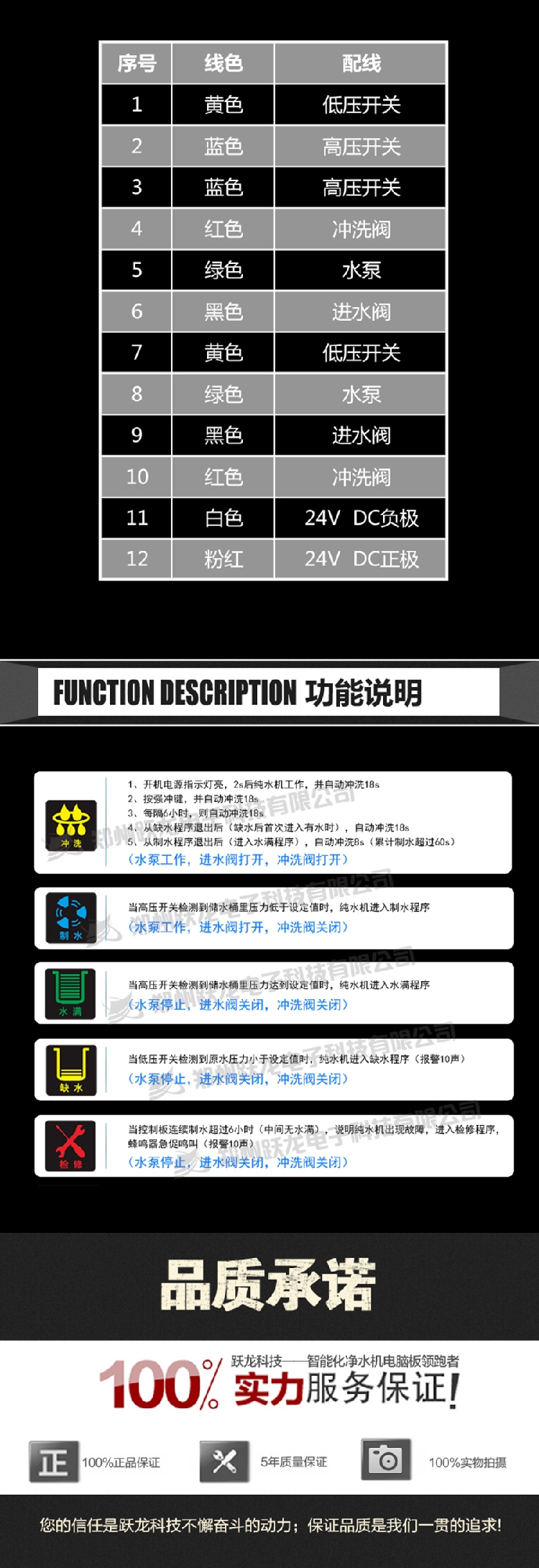 3.控制板接头线长60CM,12出线,分别为电源+(粉红),电源-(白),高压开关(蓝),高压开关(蓝),低压开关(黄),低压开关(黄),水泵(绿),水泵(绿),进水阀(黑),进水阀(黑),冲洗阀(红),冲洗阀(红),同时接头带卡口,有效防止运输振动导致脱落或者接触不良导致故障。