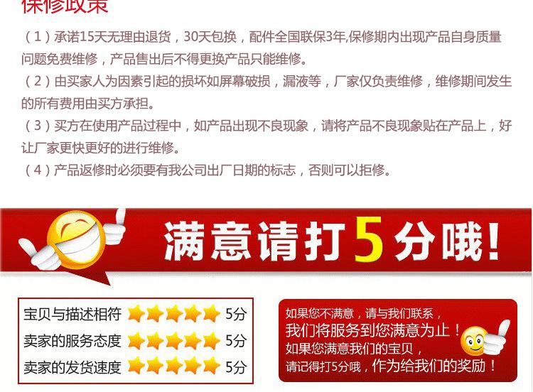 3.再好的质量也不能口说无凭,我们承诺15天无理由退货,30天包换,配件全国联保3年,终身有偿维护,质量好不好,客户的口碑最重要