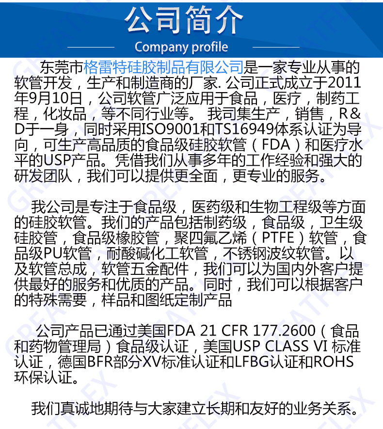 主营:硅胶软管,橡胶软管,软管总成,四氟管,塑料软管,硅胶原料,液态硅胶,复合管,清洗管,食品级软管,制药级软管,卫生级软管,生物工程…