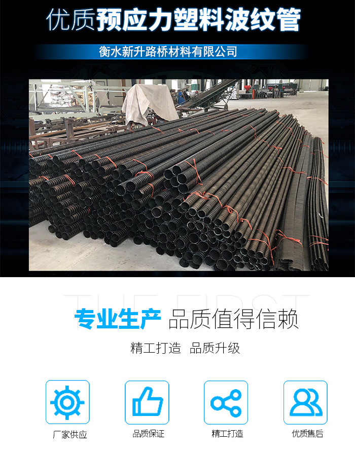 桥梁预应力波纹管,又名预应力金属波纹管。灌注混凝土过程中,塑料波纹管被震捣棒捣破或捣扁而使钢束不能穿过。