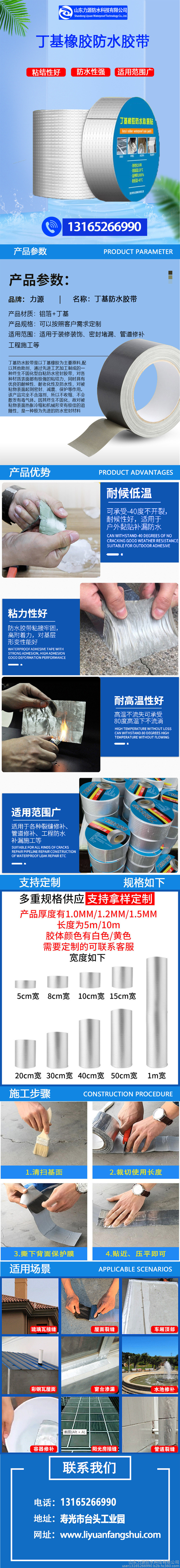 丁基橡胶自粘防水胶带是以合成高分子丁基橡胶、高聚物SBS和道路专用沥青,辅以增粘剂、抗老化剂、防腐剂、防锈剂、抗酸碱剂等多种化工制剂制成自粘型防水防腐堵漏密封的产品。