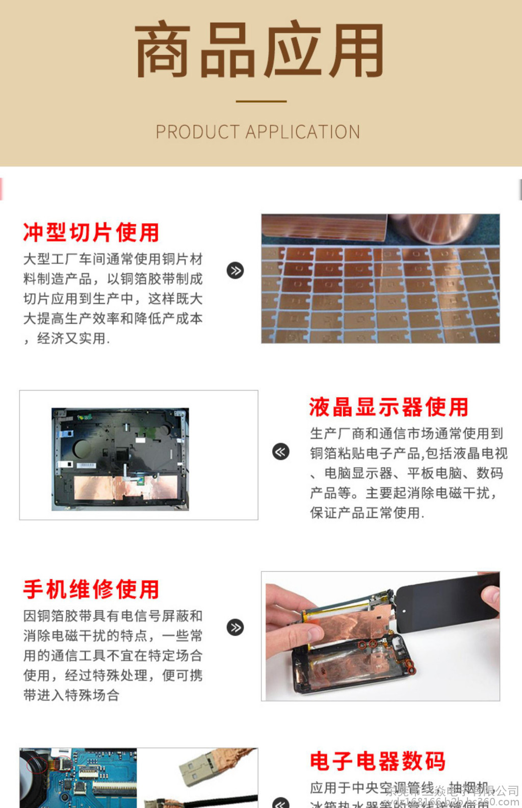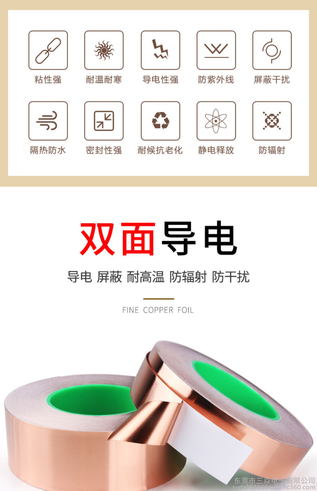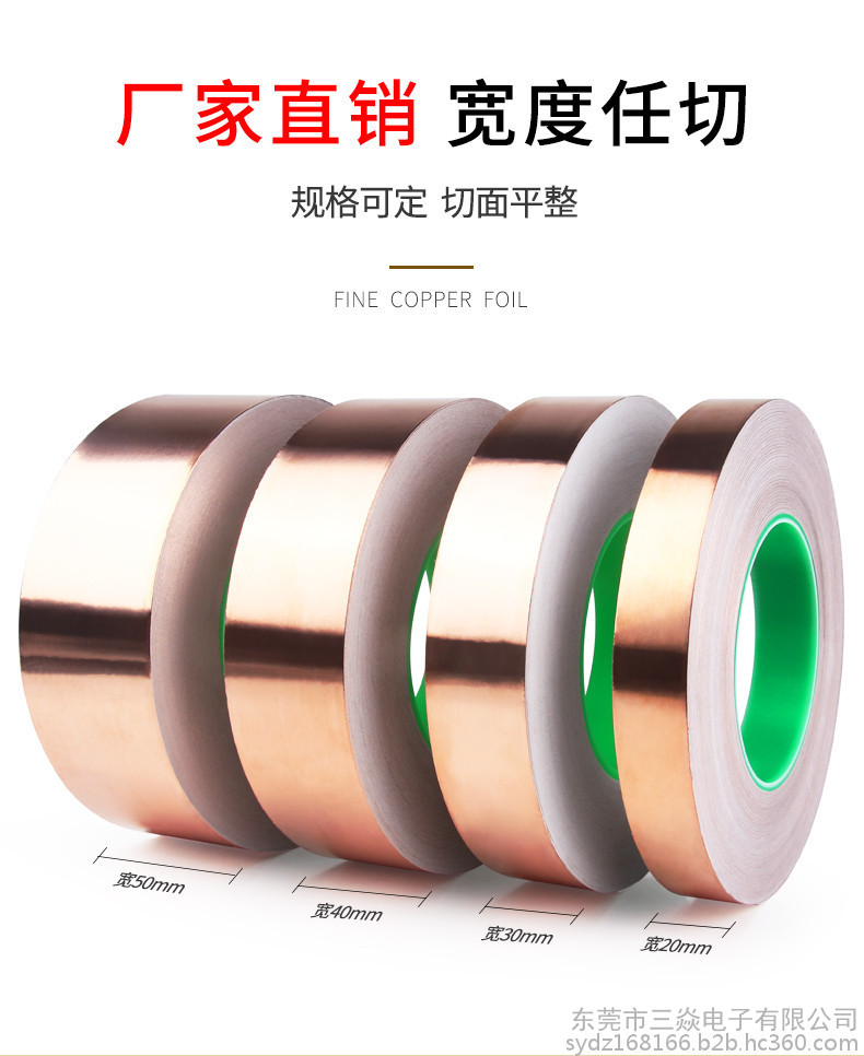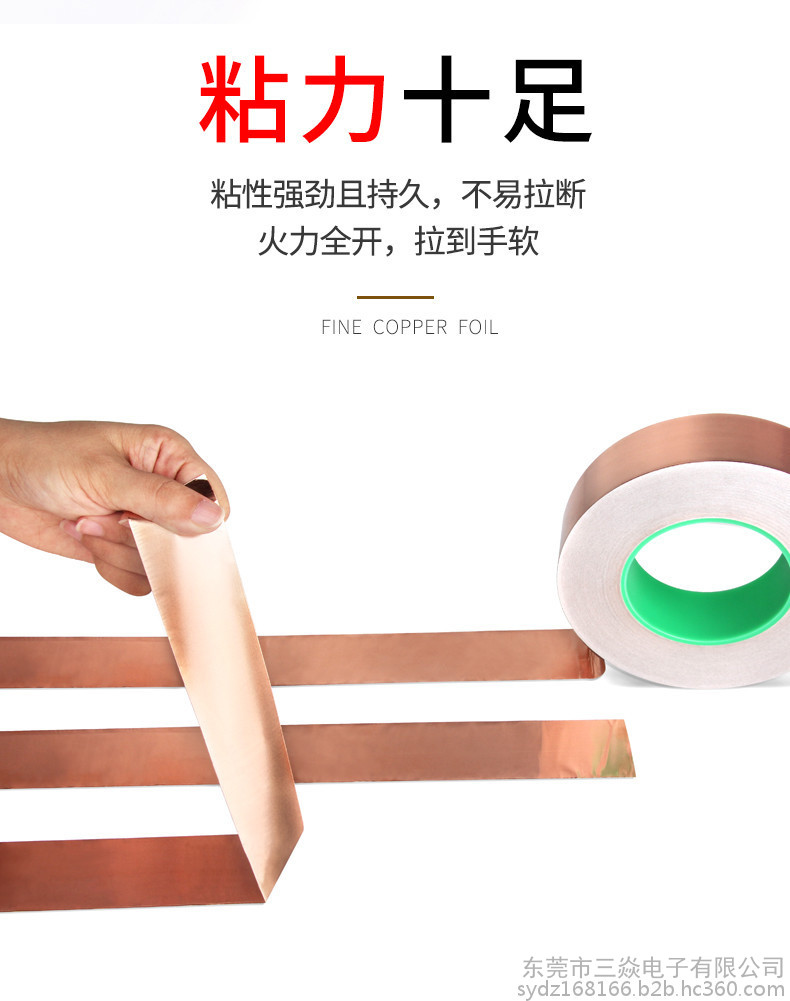 是一种金属胶带,主要应用于电磁屏蔽,分电信号屏蔽和磁信号屏蔽两种,电信号屏蔽主要是依靠铜本身优异的导电性能,而磁屏蔽则需要铜箔胶带的胶面导电物质"镍"来达到磁屏蔽的作用,因而被广泛应用于手机,笔记电脑和其他数码产品之中。目前市场上常用到的铜箔胶带的一般检验性能如下:材质:CU 99.98%