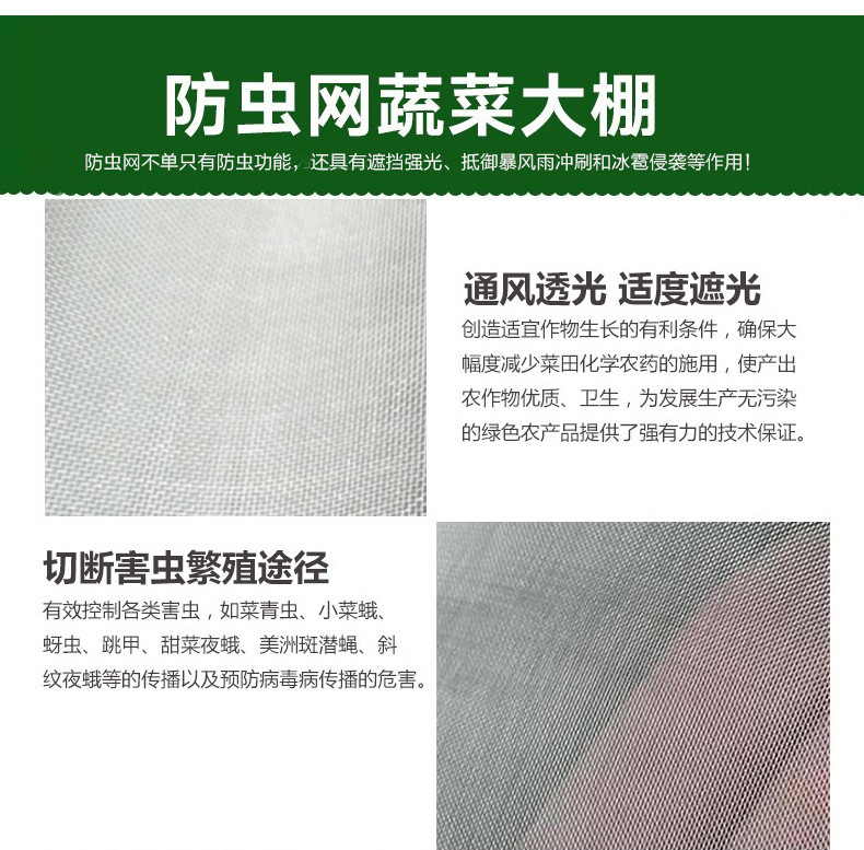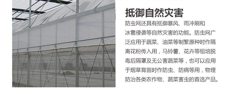 防虫网是一种采用添加防老化、抗紫外线等化学助剂的聚乙烯为主要原料,经拉丝制造而成的网状织物。它具有拉力强度大、抗热、耐水、耐腐蚀、耐老化、无毒无味、废弃物易处理等优点。能够杀灭常见的害虫,如苍蝇、蚊子等。常规使用收藏轻便,正确保管寿命可达3—5年左右。 防虫网覆盖栽培是一项增产实用的环保型农业新技术,通过覆盖在棚架上构建人工隔离屏障,将害虫拒之网外,切断害虫(成虫)繁殖途径,有效控制各类害虫,如菜青虫、菜螟、小菜蛾、蚜虫、跳甲、甜菜夜蛾、美洲斑潜蝇、斜纹夜蛾等的传播以及预防病毒病传播的危害。且具有透光、适度遮光等作用,创造适宜作物生长的有利条件,确保大幅度减少菜田化学农药的施用,使产出农作物**、卫生,为发展生产无污染的绿色农产品提供了强有力的技术保证。防虫网还具有抵御暴风雨冲刷和冰雹侵袭等自然灾害。 防虫网广泛应用于蔬菜、油菜等制繁原种时作隔离花粉传入用,马铃薯、花卉等组培脱毒后隔罩及无公害蔬菜等,也可以应用于烟草育苗时作防虫、防病等用,目前是物理防治各类农作物、蔬菜害虫的**产品。真正让广大消费者吃上“放心菜”,为我国菜篮子工程作出贡献。