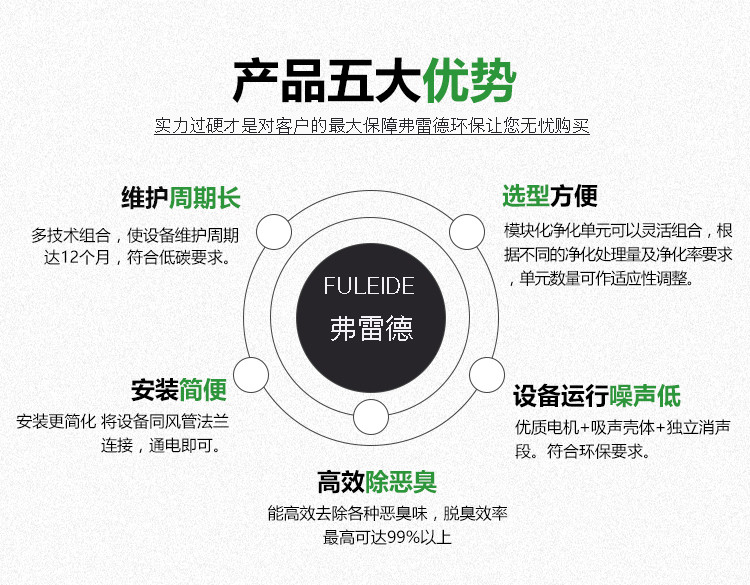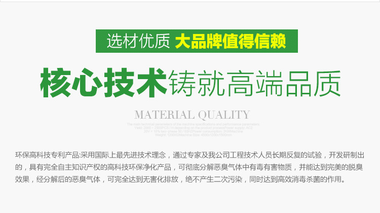 7、环保高科技产品:采用国际上先进技术,可彻底分解恶臭气体中有毒有害物质,并能达到脱臭效果,经分解后的恶臭气体,可完全达到无害化排放,绝不产生二次污染。