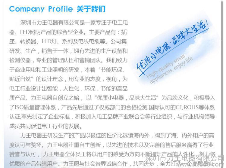 深圳市力王电器有限公司是一家专注于电工电器、LED照明产品的综合型企业。主要产品有:插座、转换器、LED灯、系列及电线电缆等。公司集研发、生产,销售于一体,拥有先进的生产设备和检测仪器,专业的管理队伍和营销团队。我们致力于商业用电和工业照明的研发,本着“节能环保、贴近自然”的设计理念,用专业的态度,视角,为电工行业设计出智能,人性化,环保,节能的高品质产品。力王电器自创立之始, 以“**小电器,品味大生活”为品牌文化,积极导入了ISO质量管理体系,产品先后通过了**部门的合格检测,国际认可的CE,ROHS等体系认证,率先制定了企业标准,积极加入电工品牌产业联合会等行业组织,与行业机构领导成员共同促进电工行业的发展。