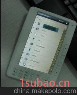 产品外壳颜色:白色,黑色●7" TFT LCD SCREEN/Resolution:800*480●Support ebook format: TXT, FB2 PDB, PDF, EPUB SKT, HTML, and etc●Support video format:MKV, AVI, RM, RMVB, VOB, landuse-dat, MP4, FLV, etc. Of the video 3GP,Support 720P HD video●Support photo format: JPG, JPEG.BMP ●Support music format: MP3,WMA,OGG,FLAC,WAV,AAC,APE ●History Skip page Read from bookmark, create bookmark, delete bookmark●massive electronic books can be download from internet●Support: picture music●Support: recording time/date and time setting, automatic shutdown, search function, information query system●Built-in 4GB NAND Flash ,Suport micro SD card●Built-in polymer Lithium battery,can read books more than 4 hours ●Accessories: earphones, USB line, specifications, power adapter