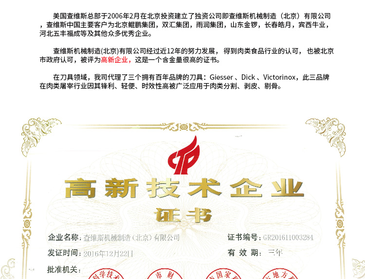 第二、产品质量有保证,安全系数高标准。查维斯系列设备通过美国农业部USDA和欧盟CE认证;
