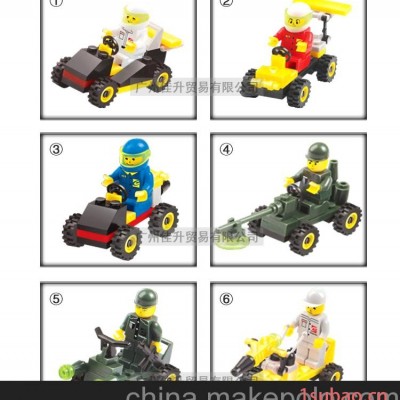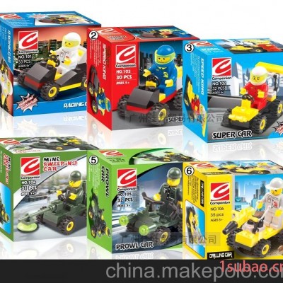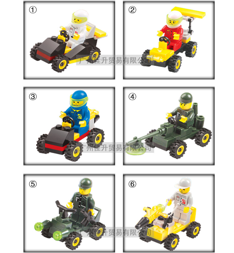 该产品一套共有6款,形态各异,其中包括赛车、跑车1、跑车2、清扫车、警备车、钻孔车。兼容乐高小积木,与万格、小鲁班小颗粒兼容。适合单款售卖及搭配销售。每车搭配一人偶,人偶均由10-11PCS积木组成。
