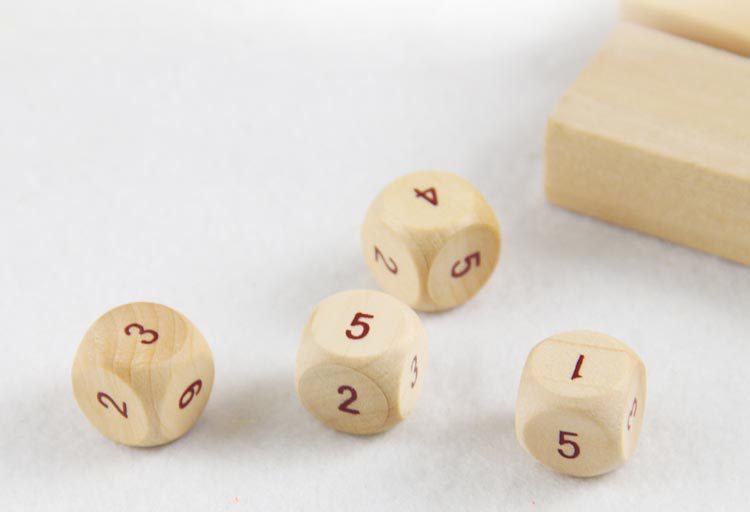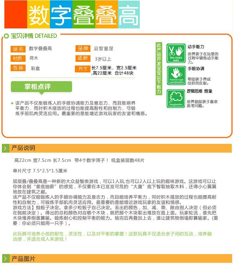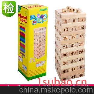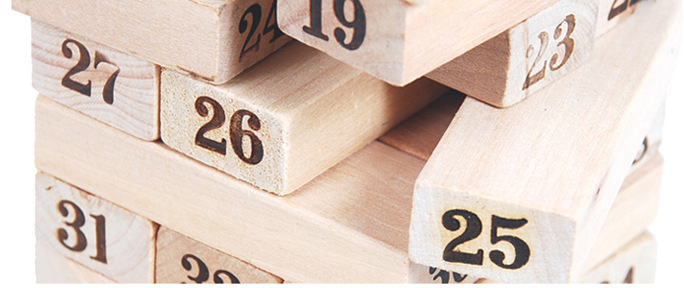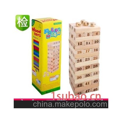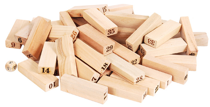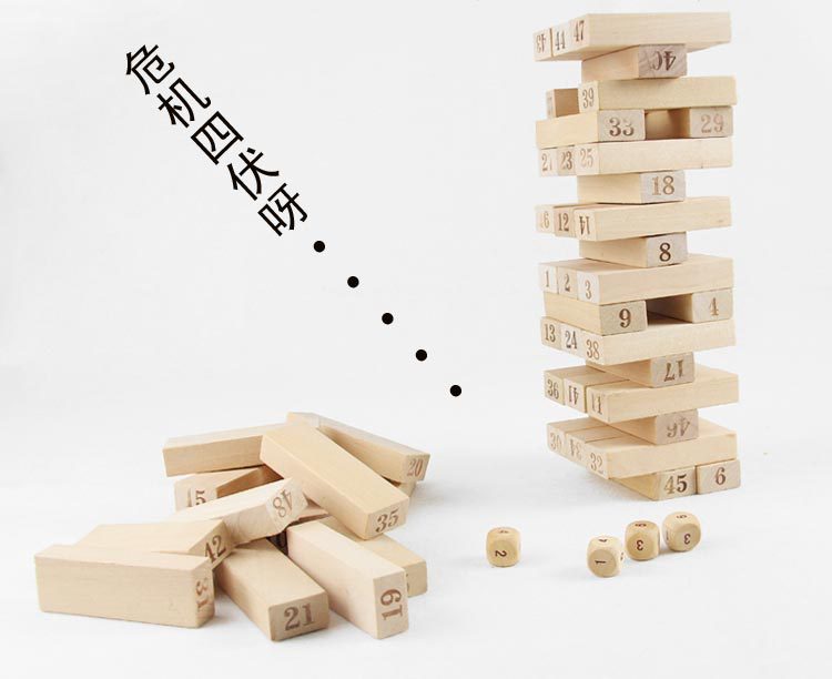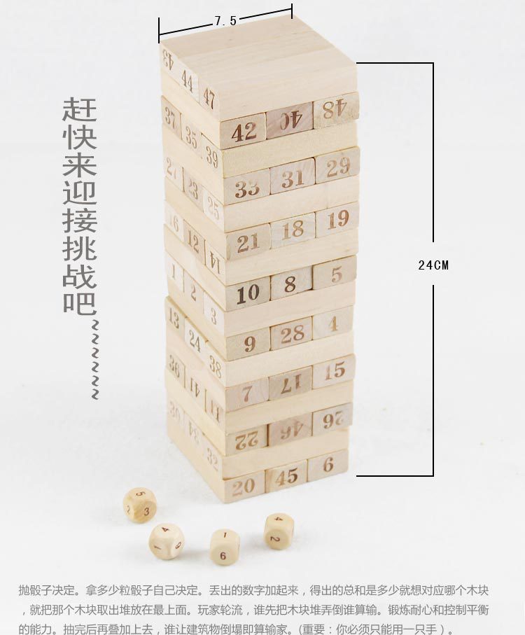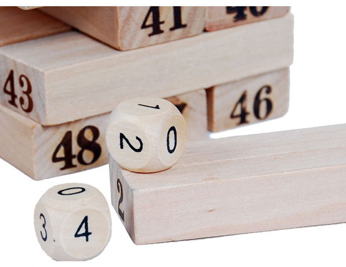 第3种玩法:每人掷4个骰子,利用加减乘除得出一个2位数字,然后抽出积木里对应的一根,然后放在上面,或者放在一边,谁抽出积木时积木倒了就算输.当然一个人抽着玩也可以。